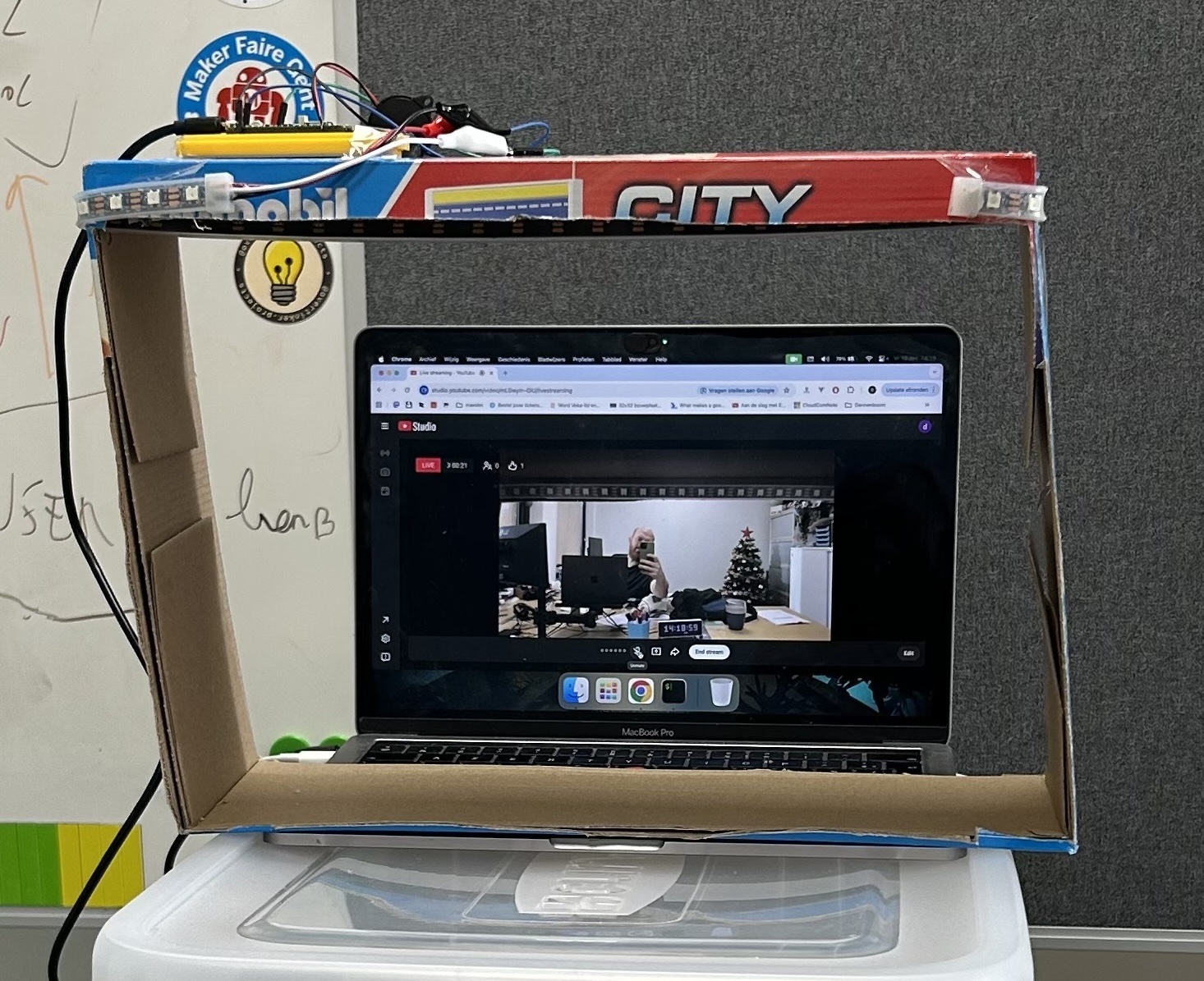 Op de website van o.dennenboom kon je een livestream van ons kantoor zien. Bovenaan de stream, hing een fysieke LED-strip. Door op een knop te drukken op de website, begonnen de lichtjes van de led-strip te flikkeren en speelde er een 8-bit versie van Jingle Bells te spelen (Op sommige momenten hebben we het liedje toch moeten afzetten). Zo werden ook wij gewaarschuwd als iemand aan het kijken was en konden we eens zwaaien.